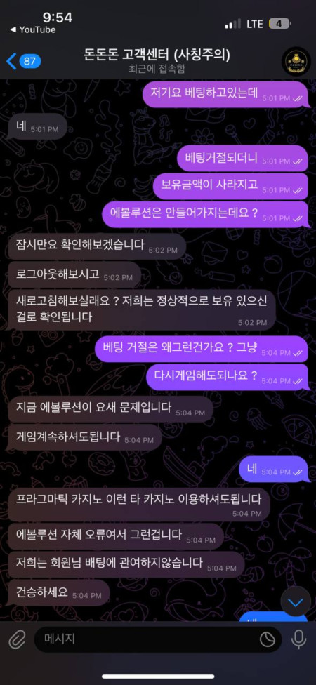 게임중간에 베팅거절한번 있었는데 그거 갖고 베팅검수후 2-3일후에 환전준다는 아랍어를 시부리더니 원금도없고 로그인도 튕구고 텔레도안보고 그대로 먹당했습니다